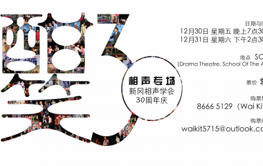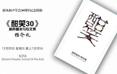 酣笑30-新风相声学会30周年庆相声汇演。参与演出的有杨世彬、黄家强、徐惠民、邱胜扬、苏维胜、纪庆荣、杨雁雁、刘晓义、郑光辉、孙雅欢、姚智祥、何佳文、刘伟嘉、纪尚林、纪尚肯、頼嘉鑫与梁光贤,三代相声演员济济一堂,肯定能给新加坡观众带来无比丰盛的“笑的艺术”的享受。